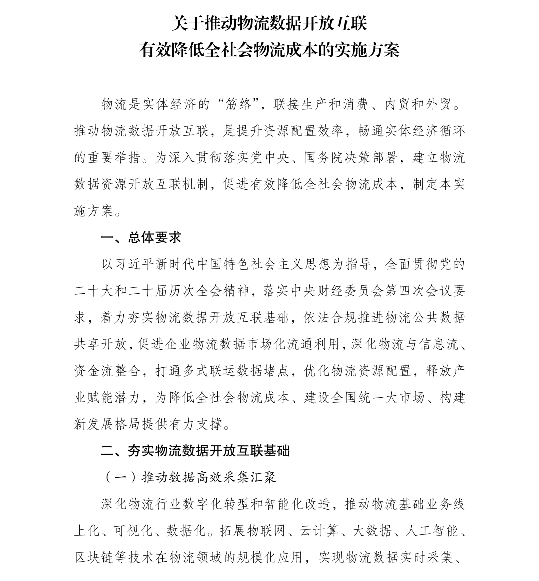 为全面贯彻党的二十大和二十届历次全会精神,落实中央财经委员会第四次会议部署和《有效降低全社会物流成本行动方案》有关要求,推动建立物流数据资源开放互联机制,促进有效降低全社会物流成本,国家发展改革委、国家数据局、中央网信办、交通运输部、海关总署、市场监管总局、国家铁路局、中国民航局、国家邮政局、中国国家铁路集团有限公司制定了《关于推动物流数据开放互联 有效降低全社会物流成本的实施方案》。现印发给你们,请结合实际抓好落实。
